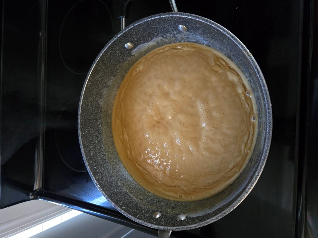 In a separate pan, I started making the caramel sauce. I poured in one can of coconut milk and let it boil for seven minutes over low heat. Once boiling, I added one cup of sugar and stirred until it thickened. When the sauce was ready, I set aside a portion for the topping and left the rest in the pan.