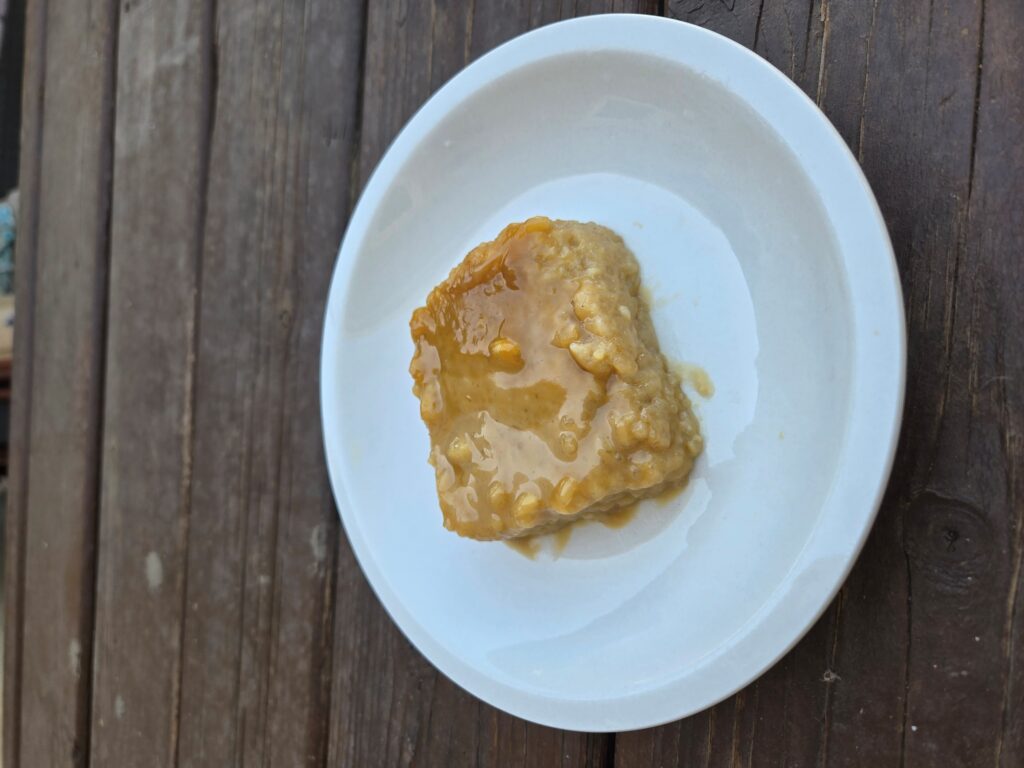 Still on low heat, I transferred the cooked rice into the caramel sauce and stirred until it became dry and sticky. I continued stirring until I reached my desired consistency. After letting it cool for a few minutes, I placed it in a square pan, topped it with the reserved caramel sauce, and baked it for 18 minutes.