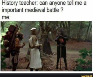 The two pictures above are screenshots of memes students created for the assignment last semester. The first image, is a picture that I feel we have ALL seen used in a meme. I love that they drew a connection to the historical content with an image that has been insanely popular. The second one really highlights the sense of humour of that student. That is part of the joy in giving students that creative license and connecting it to the content we are learning about, is their individual creativity can really be highlighted.
