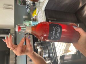 The photo on the left shows the type of juice she adds to her second ferment. Her favourite juice flavour to add is Raspberry Juice. Madison recommended leaving the bottle for about 7 days at room temperature. After about 7 days the bottle can be transferred to the refrigerator to halt fermentation and prevent over-carbonation. Refrigeration, she shared, prevents it also from becoming too sour.